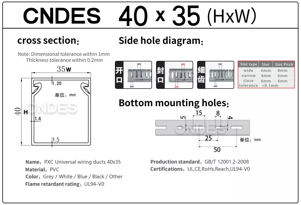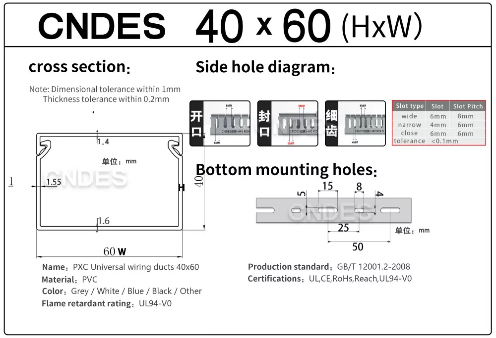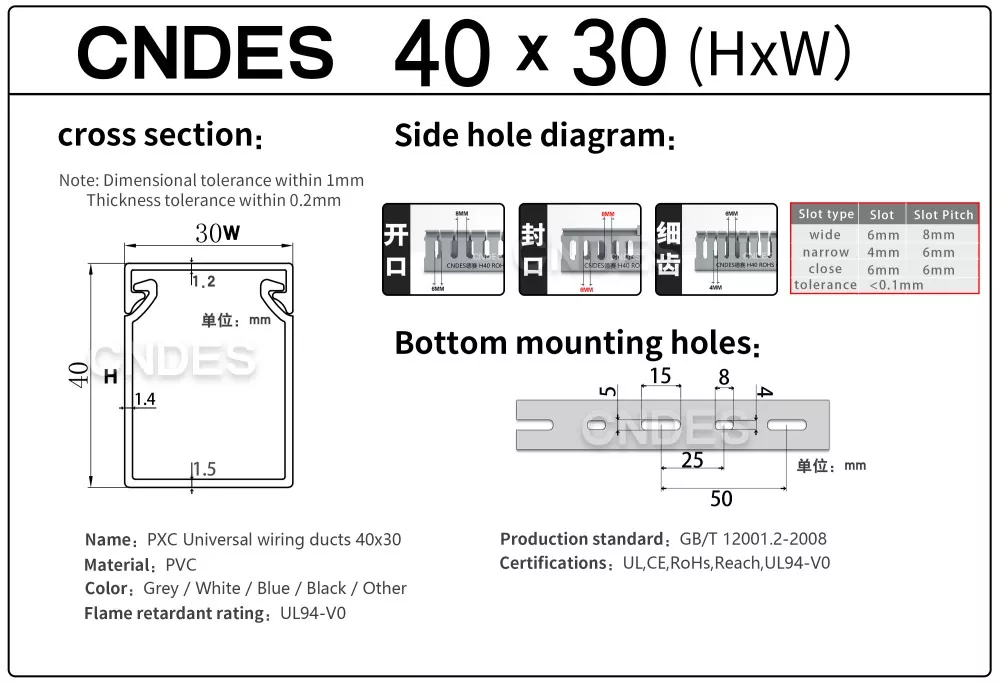 CNDES는 슬롯형 PVC 배선 레이스웨이 덕트 제조업체 및 공급업체를 선도하고 있습니다. 여기서는 40*25, 40*30, 40*35, 40*40 및 40*60을 포함한 40mm 높이의 케이블 트레이를 소개합니다.