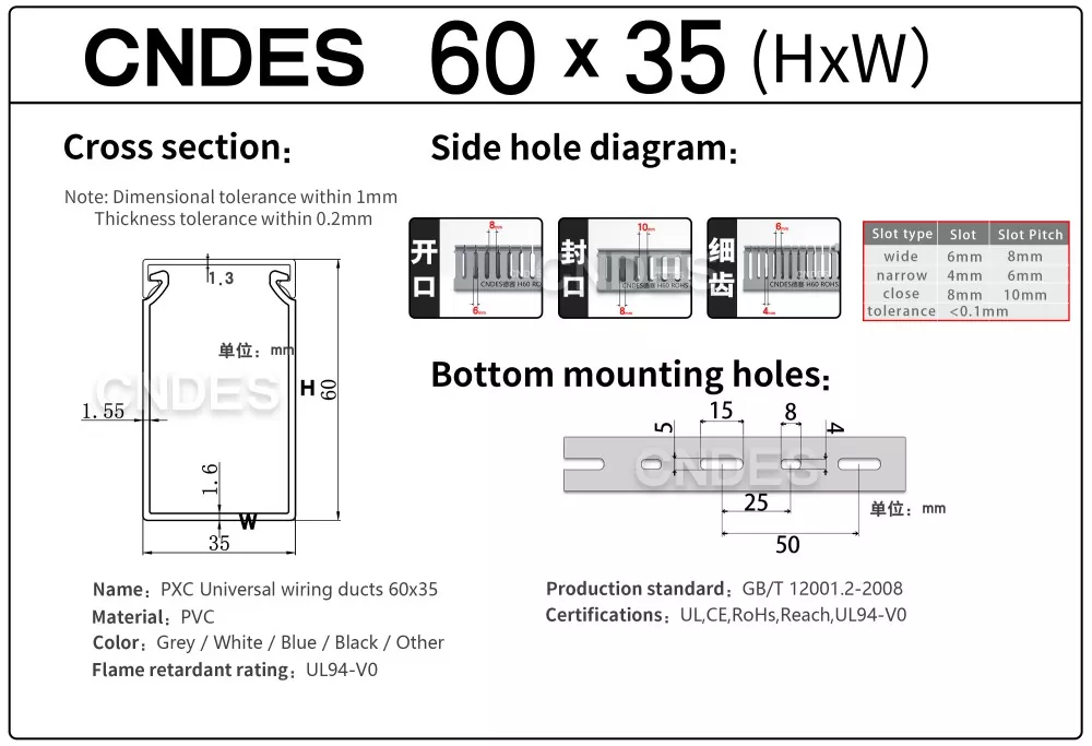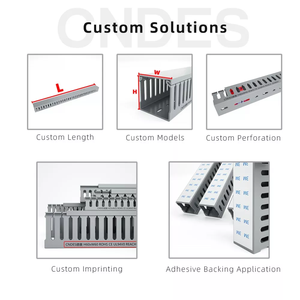 CNDES에서는 배선 덕트에 대한 포괄적인 맞춤화를 제공합니다. 당사의 서비스는 전문적인 기능적 특징(정전기 방지, 자외선 차단, 쉽게 파손됨) 및 전체 치수 조정(길이, 높이, 너비, 구멍 위치/프로파일/피치)부터 심미적인 브랜딩 옵션(맞춤형 색상, 로고, 텍스트 인쇄)까지 다양합니다. 우리는 또한 접착 백킹도 제공합니다.