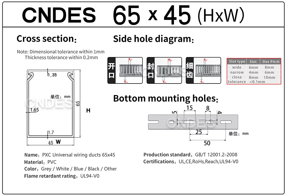 중국의 신뢰할 수 있는 제조업체 및 공급업체로부터 맞춤형 65×45 회색 슬롯형 PVC 배선 덕트를 소싱하는 경우 CNDES는 일관된 품질, 유연한 맞춤화 및 전문 서비스를 제공합니다.