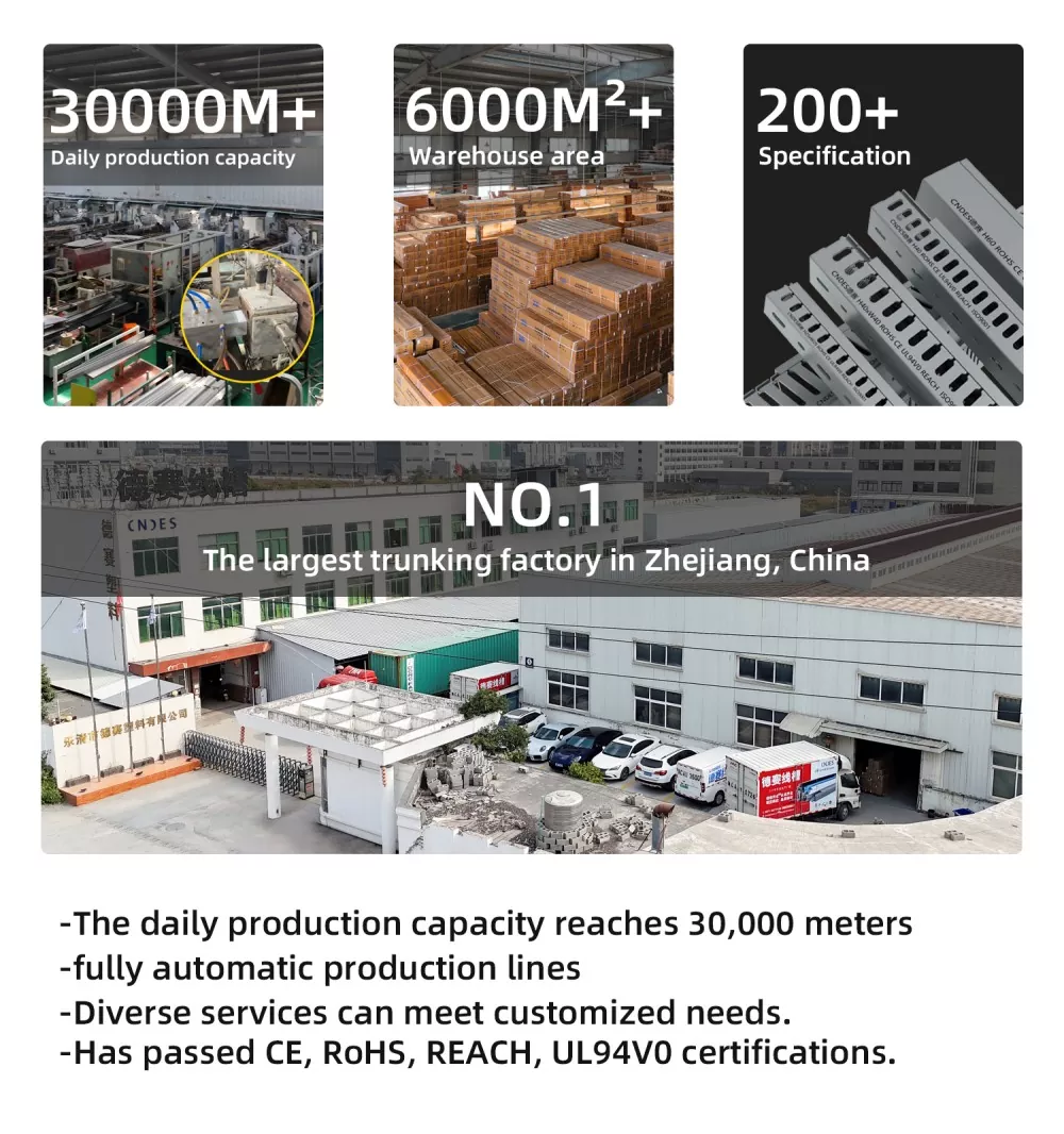 전문 PVC 배선 덕트 제조업체인 CNDES는 13개 생산 라인, 일일 생산량 최대 30000미터, 200개 이상의 사양을 갖춘 6000평방미터 창고 재고를 갖춘 안정적인 공급을 보유하고 있습니다. 당사의 품질 검사 시스템은 원자재 검사 및 실시간 생산 모니터링부터 최종 배치 샘플링까지 제품을 엄격하게 관리하여 제품의 공장 결함률이 0.5% 미만이고 항상 신뢰할 수 있도록 보장합니다.