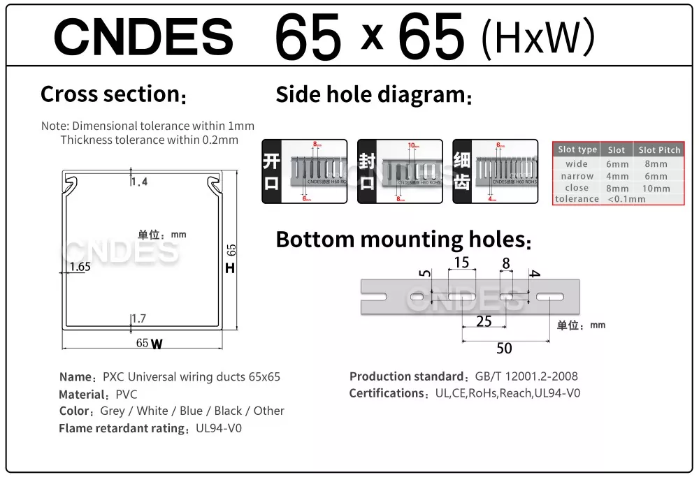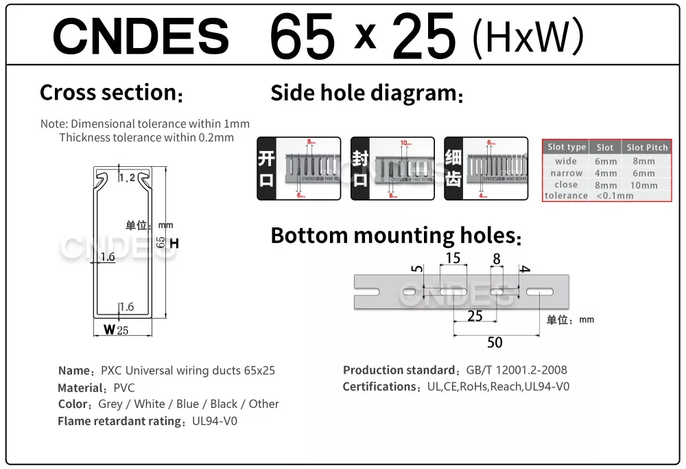 CNDES는 24년의 경험을 지닌 PVC 케이블 배선 덕트 소스 공장입니다. 맞춤형 65mm 높이 슬롯형 PVC 산업용 배선 덕트는 산업 제어 패널, 자동화 장비 및 기계 설치와 같은 고밀도 환경에서 배선을 구성하고 보호하는 데 이상적인 솔루션입니다. 65mm의 높이로 더 큰 케이블 묶음을 수용할 수 있는 충분한 공간을 제공하는 동시에 먼지, 습기 및 기계적 손상과 같은 환경 요인으로부터 최적의 보호를 보장합니다.